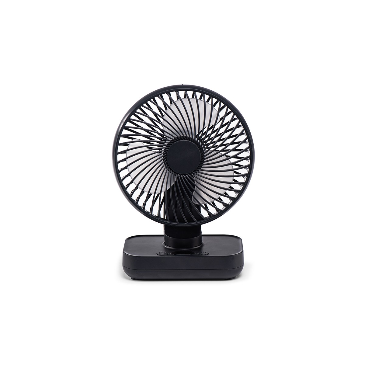 Minifan rechargeable battery-powered table fan. The fan has four airflow speeds and a rechargeable battery for wireless use.