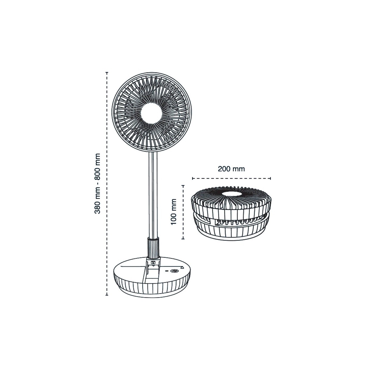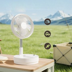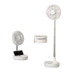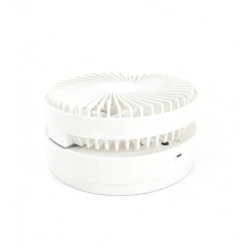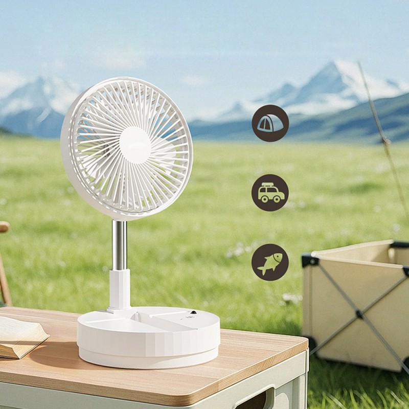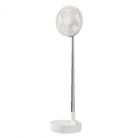 Azule table fan with rechargeable battery. A handy fan for use anywhere in the home or on the terrace. It features a rechargeable battery and is foldable for easy transport and space-saving storage. It has 4 speed settings and an oscillating function, controlled via a remote control. Height adjustable.