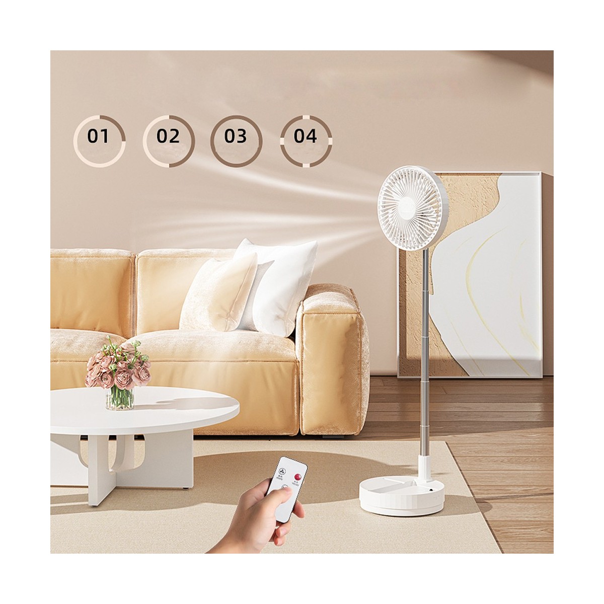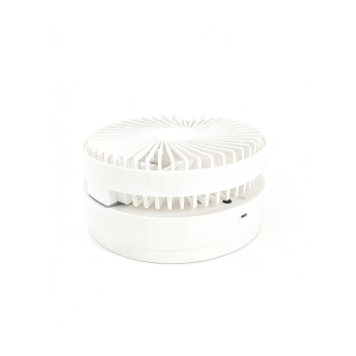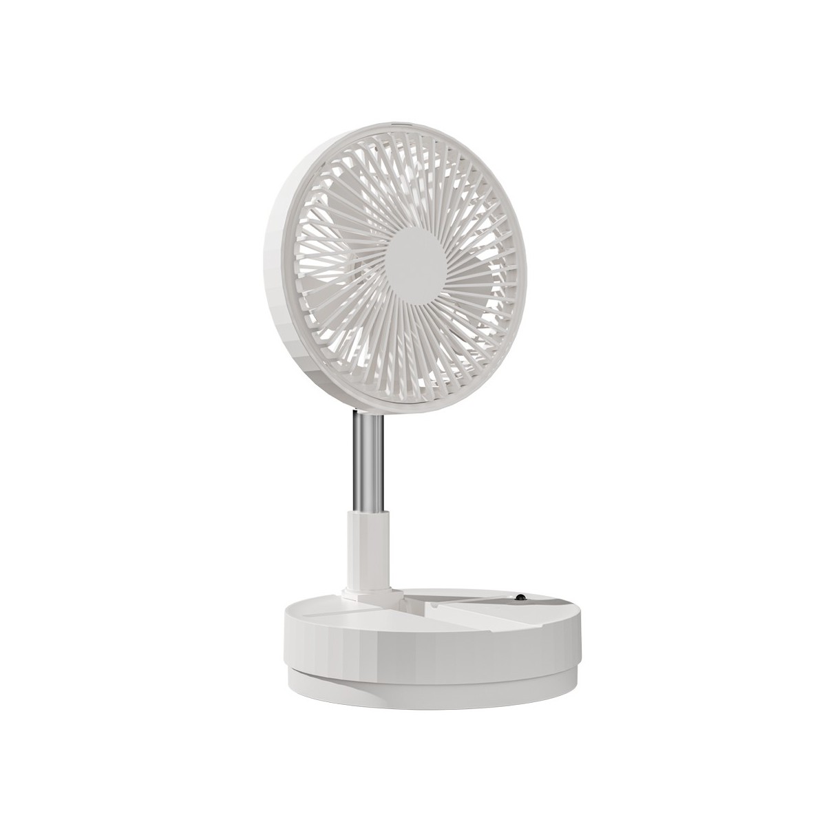 Azule table fan with rechargeable battery. A handy fan for use anywhere in the home or on the terrace. It features a rechargeable battery and is foldable for easy transport and space-saving storage. It has 4 speed settings and an oscillating function, controlled via a remote control. Height adjustable.