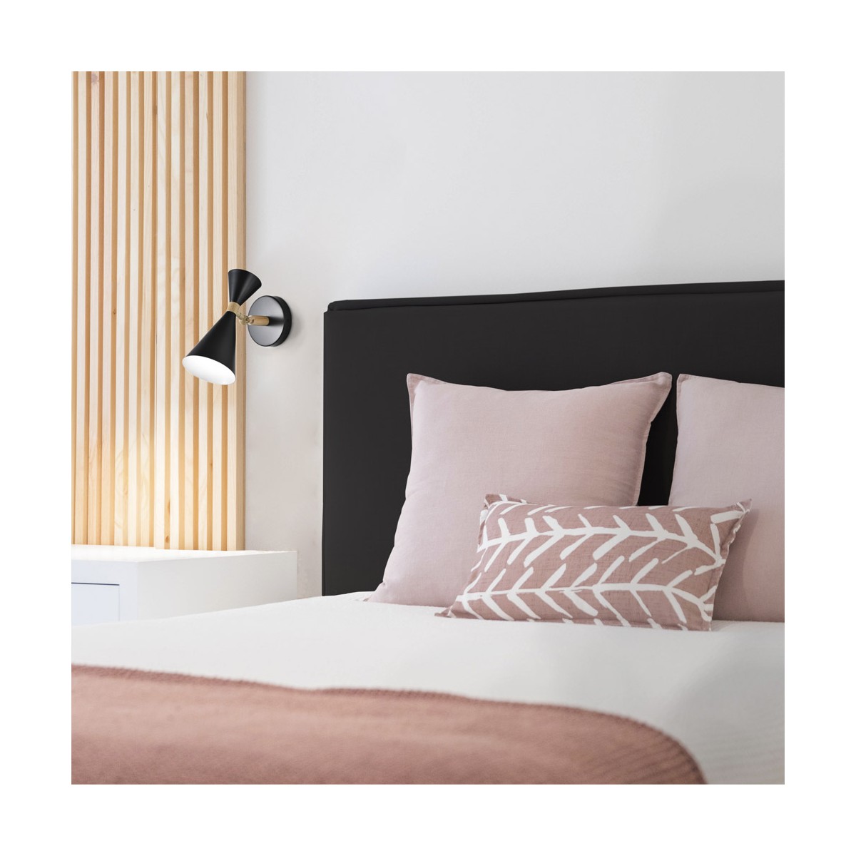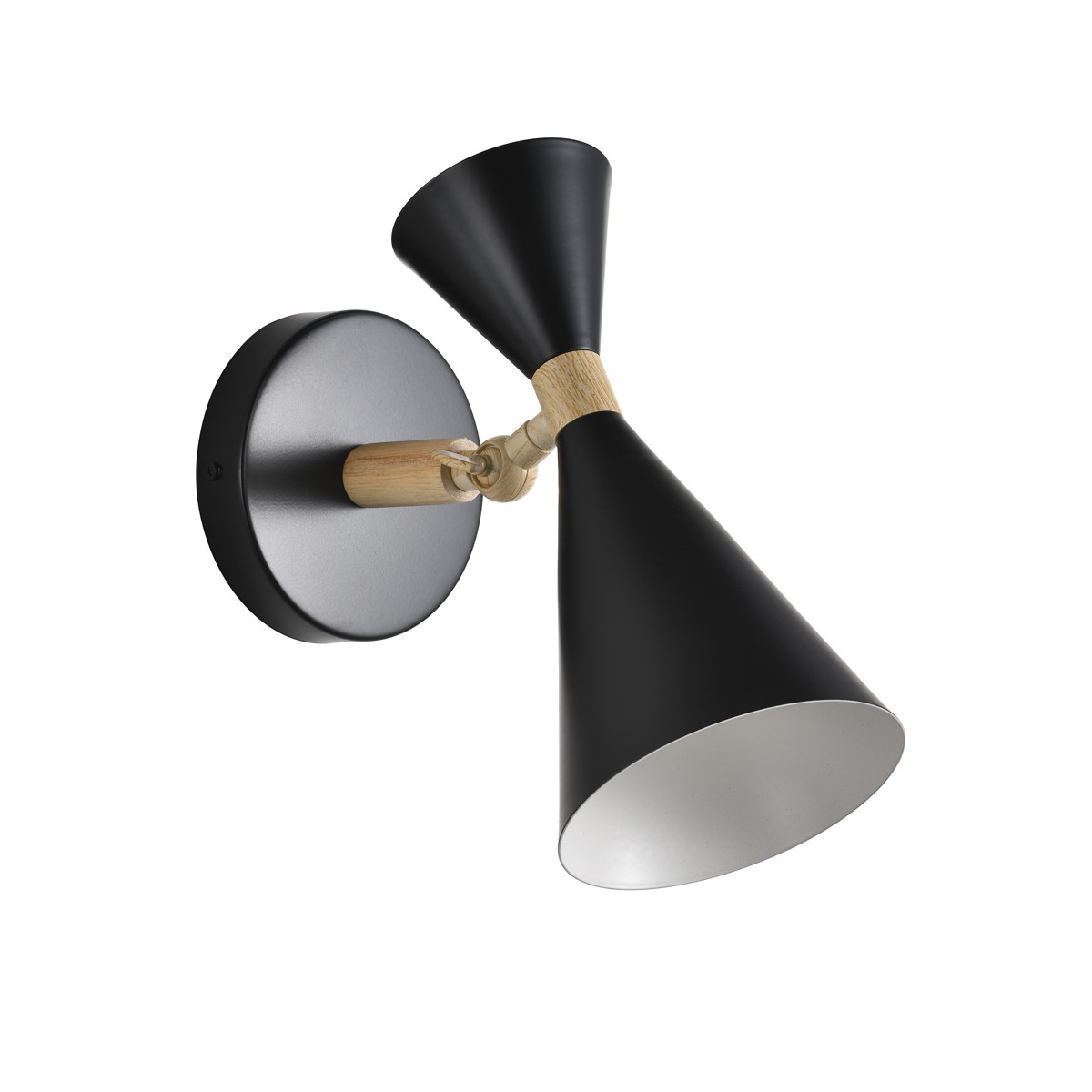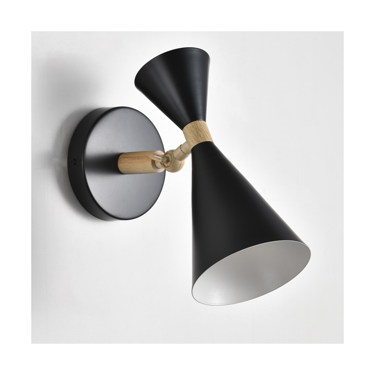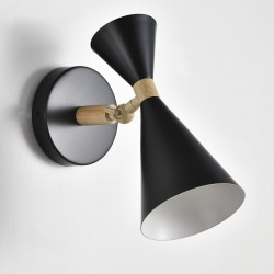 Adjustable up-down wall light. Wall lamp from the Luna collection, very practical for the functional lighting of a bedroom. Its up-down adjustable design (180º) makes it ideal for installing on either side of the bed next to the headboard. Made of black aluminium with articulated wooden detail. One light point for E27 LED bulb.