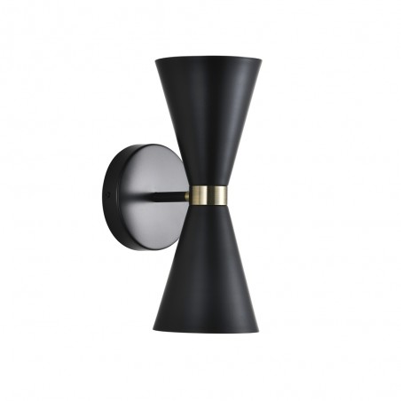 Wall lamp with two points of light. Very practical wall light to provide light in a hallway or passageway. Two black conical shapes with a small metal piece as a union and decorative touch. The light is projected upwards and downwards creating an optimal ambient lighting.
