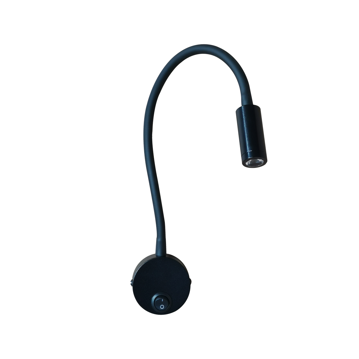 Flexible wall lamp for the bedroom. Wall light designed to be used as an auxiliary or reading light next to the headboard of the bed. Flexible structure, focused LED light point and ON/OFF switch on the base. Perfect for contract projects in hotel rooms by placing one on each side of the headboard. Made of black aluminium with flexible body.