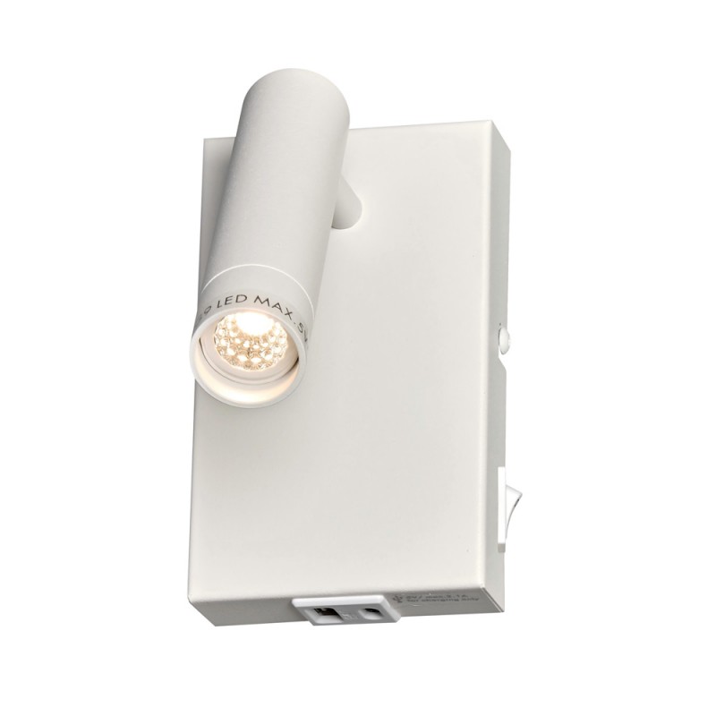 Slim wall light with adjustable reader. Practical wall lamp to install on the wall next to the headboard or on the bedside table. It has an adjustable tubular spotlight for use as auxiliary or reading light. The wall lamp has an ON/OFF switch on one side and two USB ports (A and C).