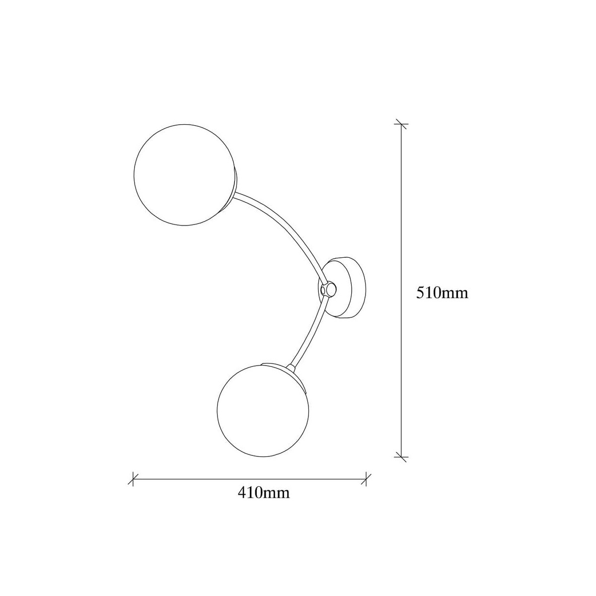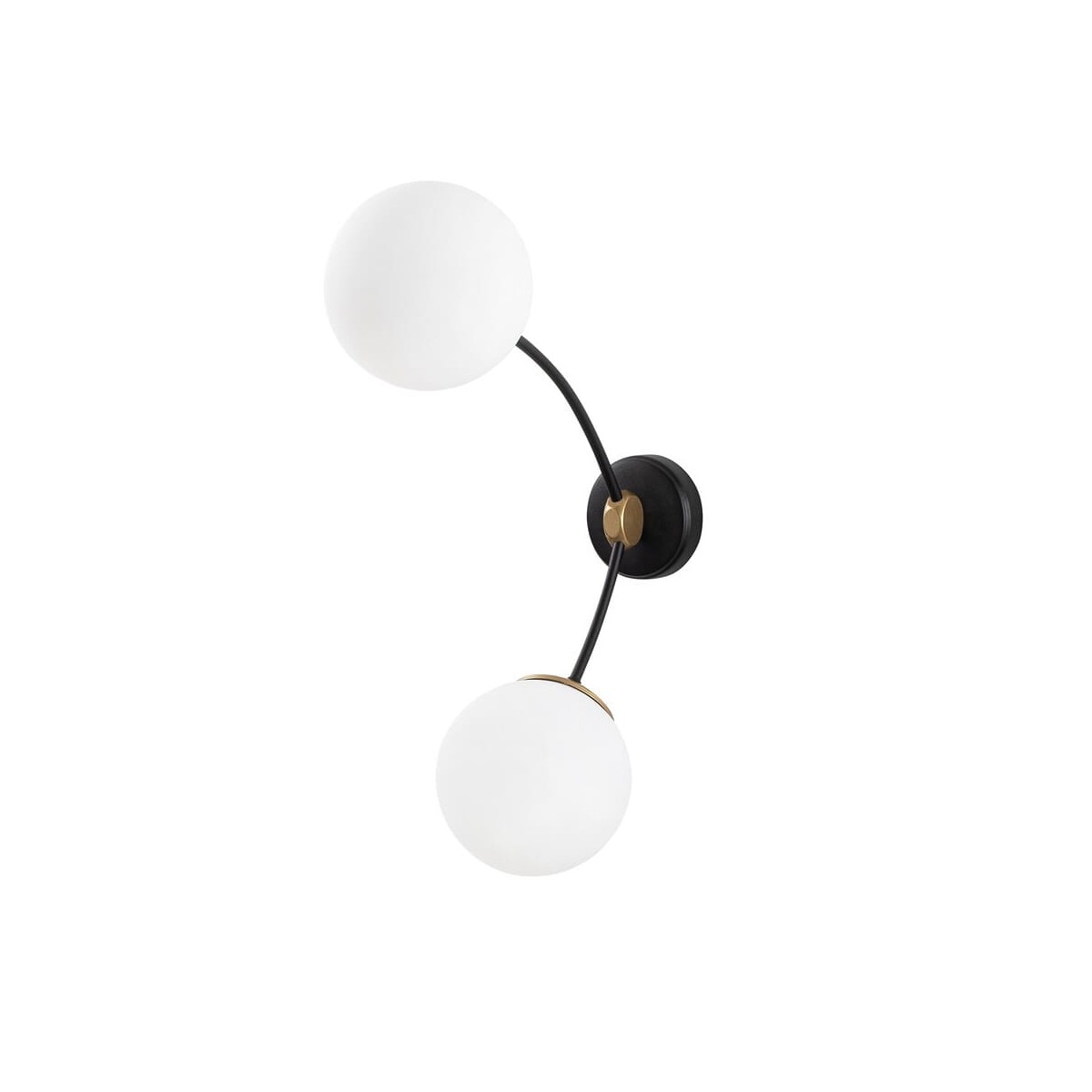 Decorative wall lamp with black metal arms with two lights and frosted white glass shades. The lamp is 51cm high. It works with E27 bulbs, not included.