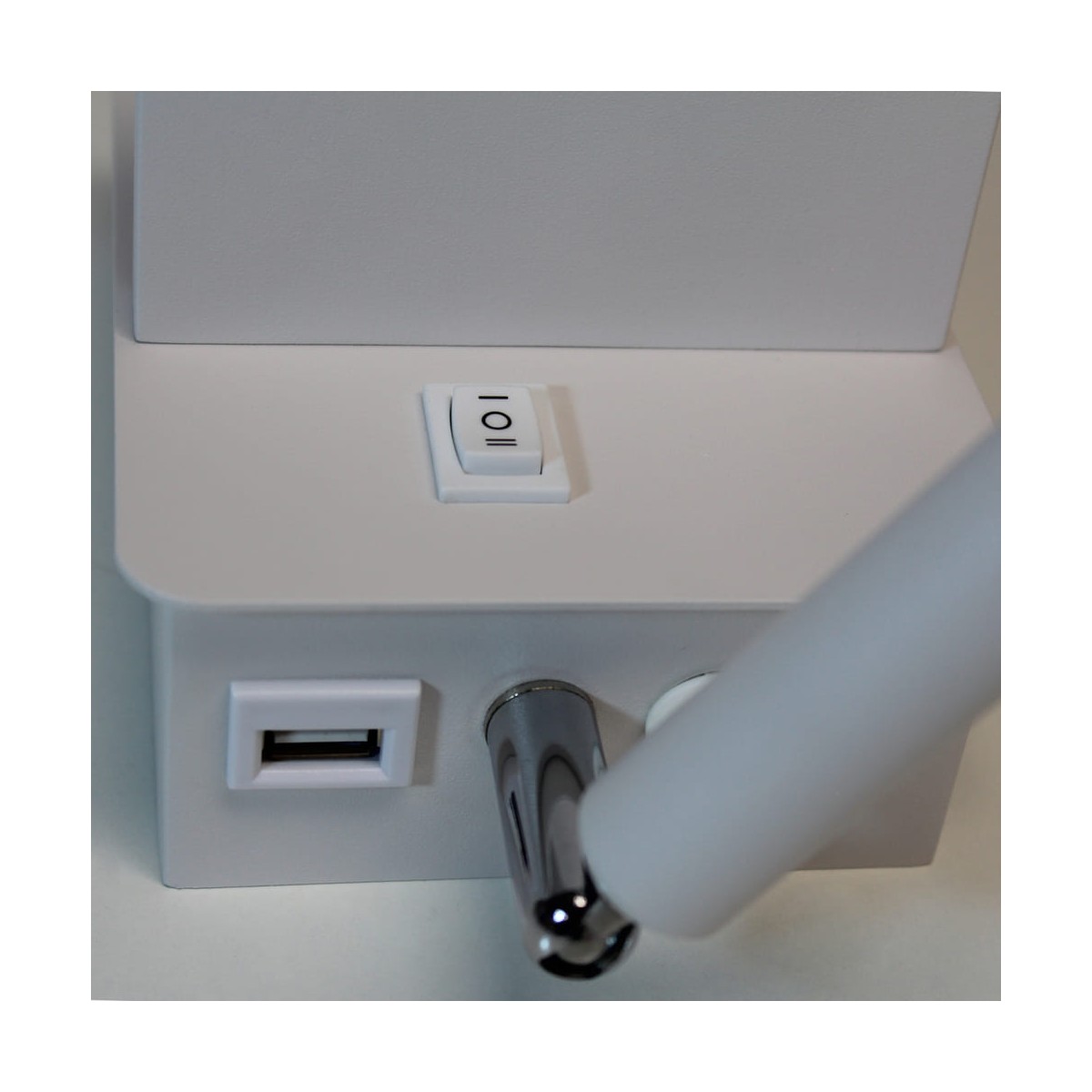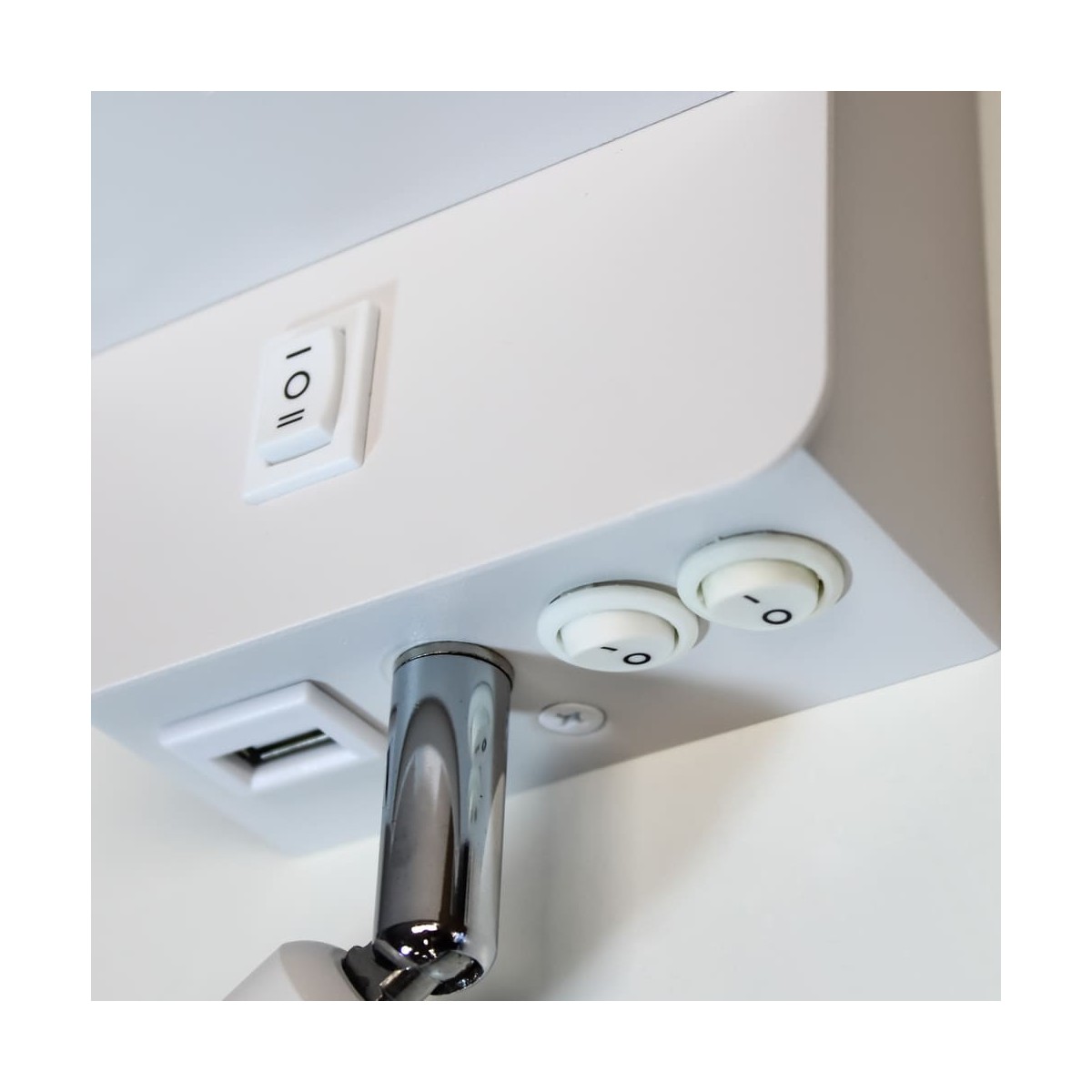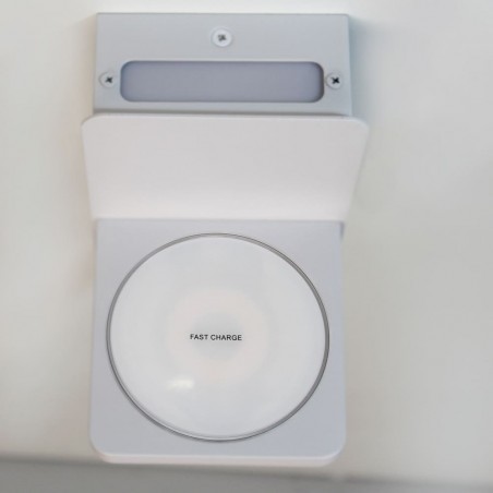 Decortive white wall light with LED lighting. Two warm lights 5W+3W. It has two switch, a USB (5V 2000mA) and a wireledd charging for the compatible mobile phone charge. The spotlight is completely orientable.